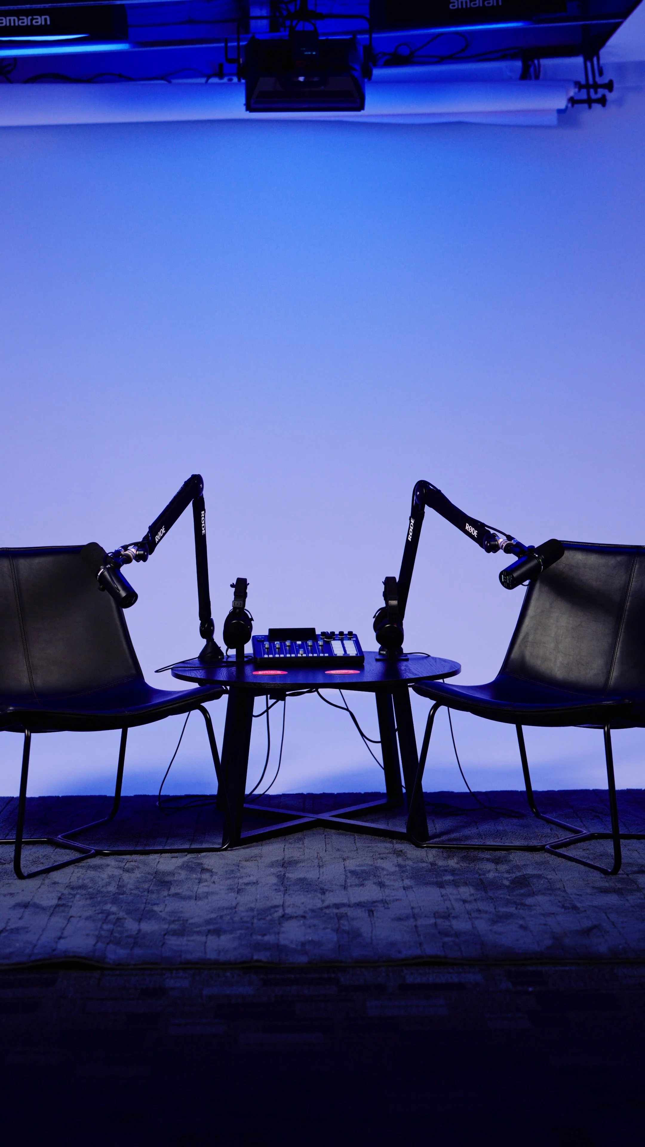 A podcast recording setup with two black chairs, microphones, and a small audio mixer on a round table under blue lighting.